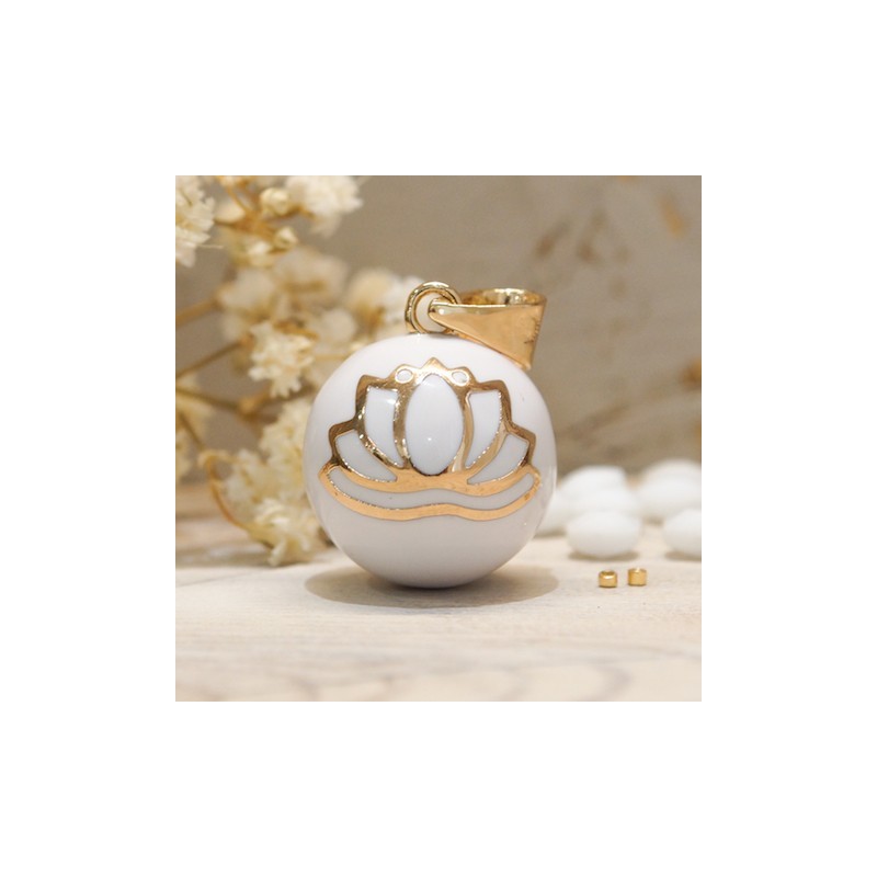 Pregnancy Bola Matte Enamel White Lotus Flower Yellow Gold Plated