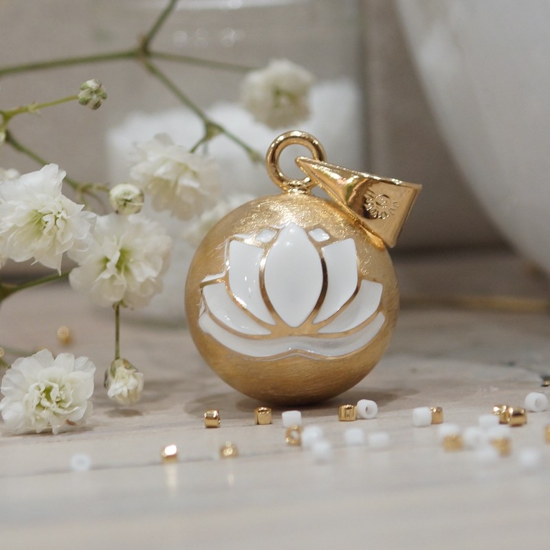 This Matte Enamel White Lotus Flower Yellow Gold Plated Bola is not just a style accessory; it is an intermediary between two worlds, serving to establish the beginnings of an auditory connection between mother and child before their first visual encounter – thereby celebrating the first pages of a shared story full of affection.